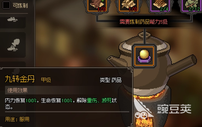 在这个游戏里药物基本上都是通过互相搭配,然后去炼制丹药,可以选择把冬虫夏草和接骨草一起使用,这样就能在游戏里炼制九转金丹,有了九转金丹之后,玩家就能恢复自身的血量和内力,假如在游戏里处于濒死或者重伤的状态,那就可以直接用这个丹药快速让自己恢复,除了这两种药材之外,还需要有野山参和何首乌,如果玩家没有的话可以直接去资源点进行药物的采集,也可以选择直接寻找道人购买。